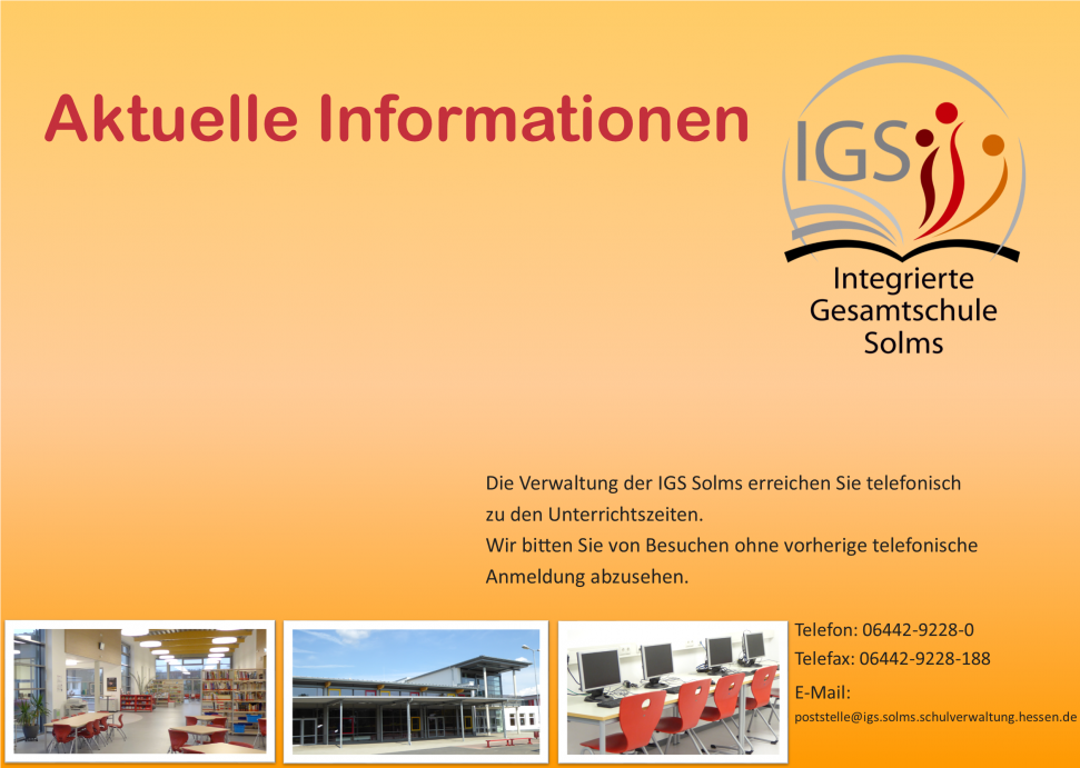 Bei Fragen gibt es die Möglichkeit über ein Formular mit einem Schulleitungsmitglied in Kontakt zu treten oder Sie nehmen mit mir, dem Stufenleiter 5/6, per E-Mail Kontakt auf unter: stefan.kern@igssolms-ldk.de. Wenn Sie Ihre Telefonnummer hinterlassen, rufe ich gerne zurück.