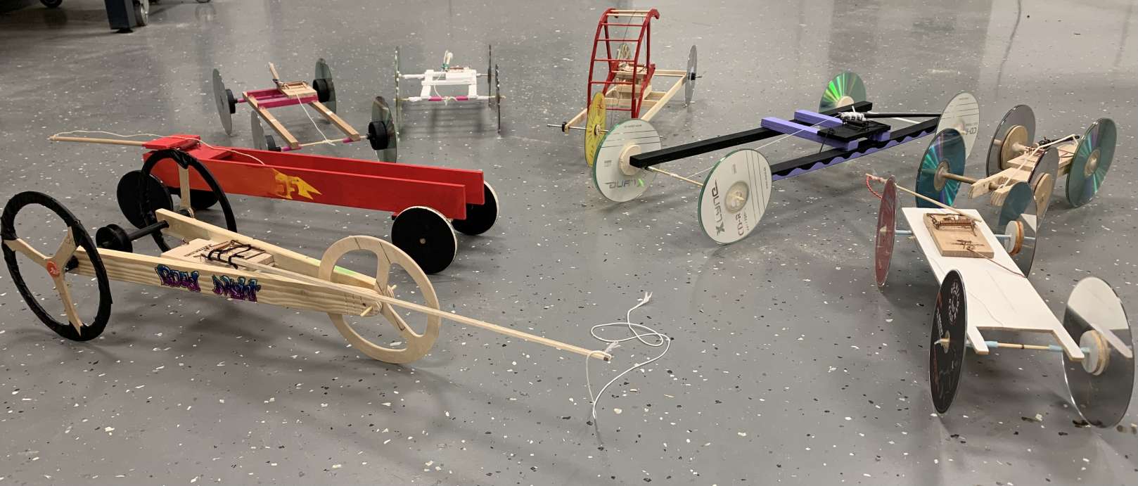 Die Schülerinnen und Schüler der Jahrgangsstufe 10 entwickelten und bauten im Wahlpflichtfach Arbeitslehre Autos mit einer Mausefalle als Motor. Im ersten Halbjahr des Schuljahres befassten sich die Jugendlichen mit den technischen Themen der Kraftübertragung, Reibung, Materialkunde, Energieerhaltungssatz, Spannarbeit und Hebelkraft um ihr geplantes Auto mit der Spannenergie einer Mausefalle möglichst weit fahren zu lassen. In Kleingruppen entstanden erfolgreich verschiedene Modelle der „Long-Distance Cars“. Unterstützt wurden die Schüler von den Lehrern Florian Hermanni, Florian Hopf und der Lehrkraft im Vorbereitungsdienst Dominik Ott. Die Motivation der Schülerinnen und Schüler zeigte sich in der Umsetzung ihrer Mausefallenautos und im Wettbewerb zu den anderen Kleingruppen, bei dem das Siegerauto von Gabriela Turcanu stattliche 15,3 m zurücklegte, dicht gefolgt von zwei weiteren Autos, die 12m Fahrtstrecke erreichten.