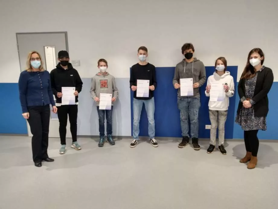 Als Schulsieger wurden von Schulleiterin Anke Wegerle und Fachleiterin Anne Hofmann geehrt: Noah Strauß, Clemens Frey, Björn Härle, Noa Asenime und Leon Lell.