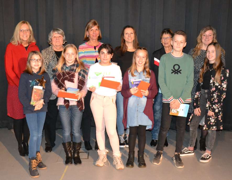 Bild oben: Schulleiterin Anke Wegerle (2. R. 1. v. links) und Schulsiegerin Anouk Massias (1. R. 3. v.l .) mit Klassensiegern, Deutschlehrerinnen und Jury.