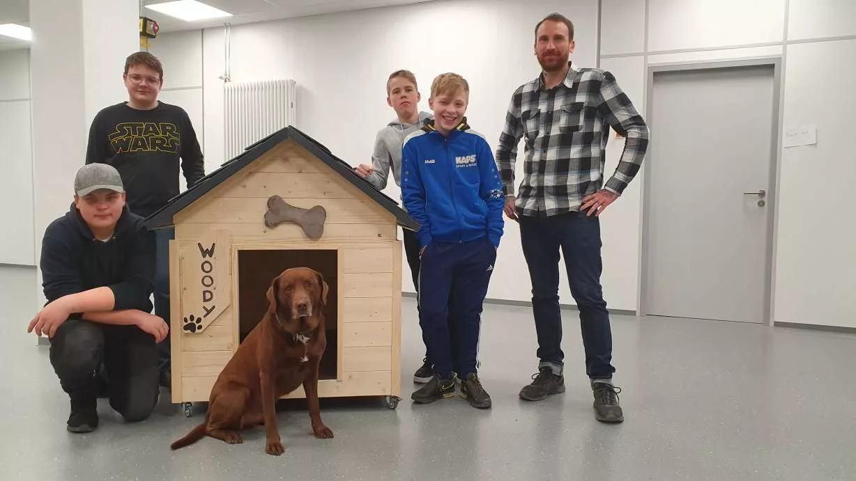 Da staunte Dennis Schäfer, Schulsozialarbeiter der IGS Solms, nicht schlecht: Im Rahmen der Hauptschulprojektprüfung hatten Tom Göllner, Lino Schäfer, Janis Feja und Nico Zinn aus der PuSch-Klasse eine mobile Hütte für Schulhund Woody gebaut. Der Förderverein der IGS Solms unterstützte das Projekt mit einem Materialzuschuss.