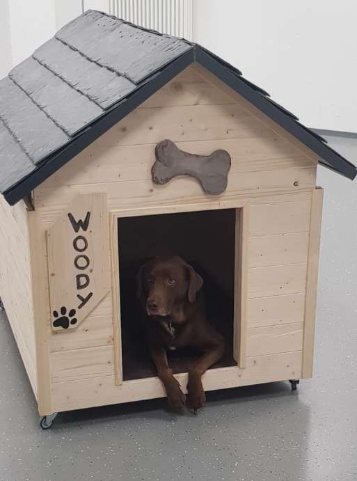 Die Hundehütte hat die Maße 1m x 1,20m x 1,20m und besteht aus Fichtenholz. Zudem verfügt sie über eine Schieferdachkonstruktion, die aufgeklappt bzw. komplett abgenommen werden kann. Durch ihre Rollenkonstruktion ist die Hundehütte fahrbar und kann somit an jeden beliebigen Ort in der Schule transportiert werden.
