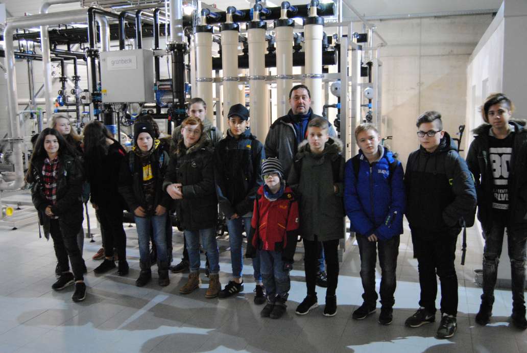Herr Kühn und ein weiterer Mitarbeiter ließen – im wahrsten Sinne des Wortes – tief blicken. So befindet sich eine Pumpstation (etwas oberhalb der Gesamtschule neben dem Sportplatz) unter der Straße. Diese Pumpe unterstützt die Förderung von Rohwasser zum Hochbehälter. Dort wird das Wasser in der Ultrafiltrationsanlage (auf dem Bild im Hintergrund zu sehen) zu gereinigtem Trinkwasser.
