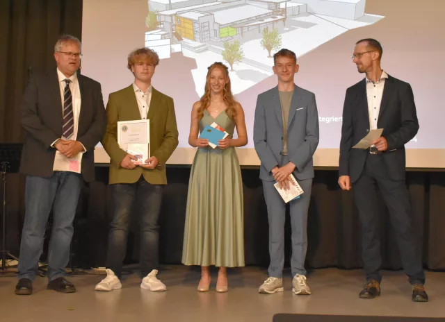 Das Bild zeigt die Siegerinnen des Kunstwettbewerbes (von l. nach r.: Mika Gienskey, Alina Schenk, Mariella Göbel, Leoni Weiß, Sonja Lehle), die Leiter der Theater-AG, Annette Harms und Roger Haberditzl sowie Schulleiter Stefan Klotz.