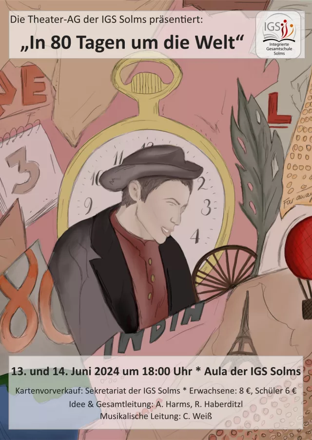Die Theater-AG der Integrierten Gesamtschule Solms lädt herzlich zu ihrem jährlichen Theaterstück ein! Dieses Jahr entführt uns das Ensemble „In 80 Tagen um die Welt“. Erleben Sie in Jules Vernes „In 80 Tagen um die Welt“ die Abenteuer von Phileas Fogg und seinem Diener Passepartout. Verfolgen Sie ihre rasante Reise um den Globus, bei der sie zahlreiche Hindernisse überwinden und eine Wette gewinnen müssen.