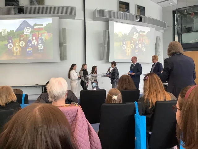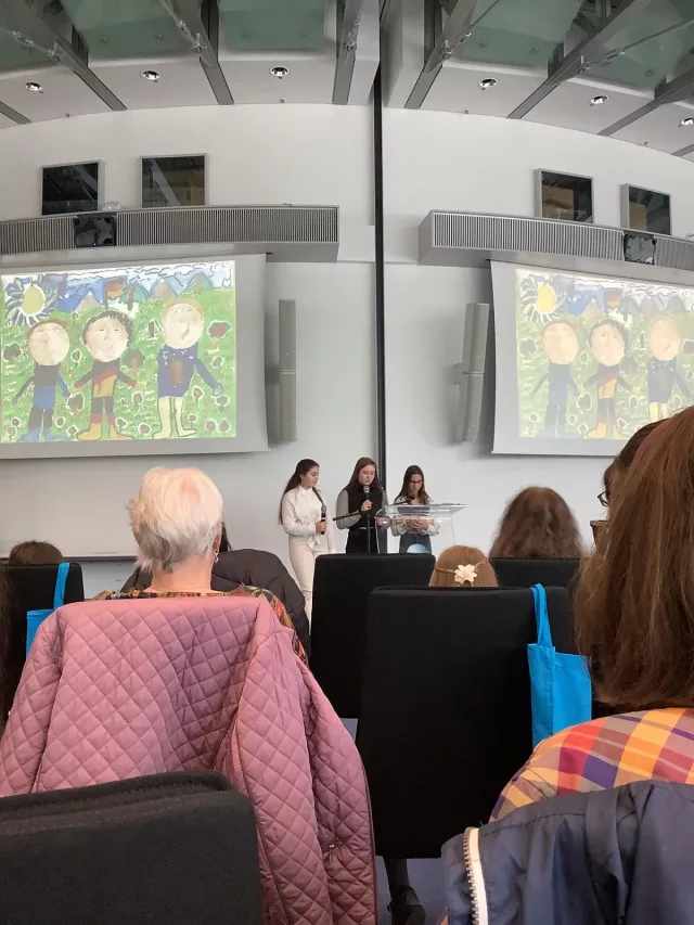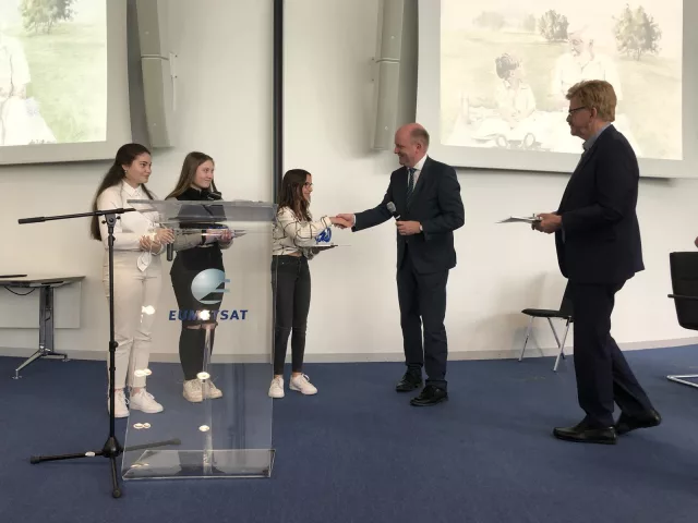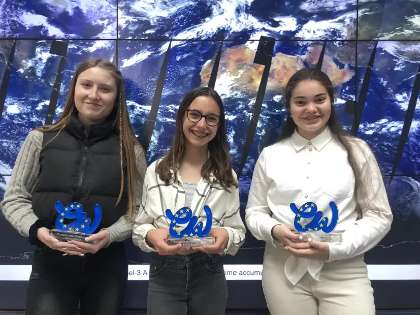 Überschwängliche Freude und unglaubliches Staunen herrschte bei den Schülerinnen Anna Keller, Hannah Schäfer und Lea Kipp, allesamt Mitglieder der Figurentheater-AG der IGS Solms, welche unter der Leitung von David Schüßler und Roger Haberditzl steht, als sie erfuhren, dass ihr Wettbewerbsbeitrag zum 70. Europäischen Wettbewerb als „Beste Arbeit des Themas“ bundesweit ausgezeichnet wurde. Die Bundessiegerehrung fand nun am 9.5.23 in Darmstadt bei EUMETSAT (European Organisation for the Exploitation of Meteorological Satellites) statt, wo im Rahmen einer großen Feierstunde der Siegerpokal u.a. aus den Händen von Staatssekretär für Europaangelegenheiten, Uwe Becker und dem Vorsitzenden des Landesverbandes der Europa-Union Hessen, Thomas Mann, entgegengenommen werden durfte, nachdem die drei Schülerinnen ihr Projekt den geladenen Gästen souverän präsentierten und dafür mit anerkennendem Applaus bedacht wurden.