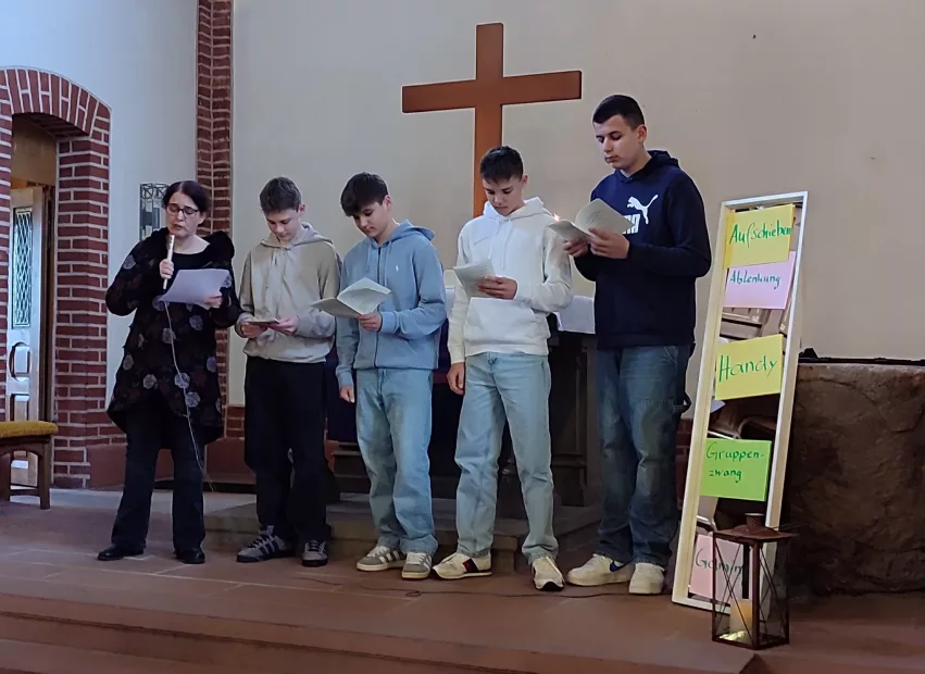 Der Gottesdienst begann mit einer Selbstreflexion der Schülerinnen und Schüler, die aufgefordert wurden, sich im Selfiemodus des Handys wie in einem Spiegel zu betrachten und über sich selbst nachzudenken. Es folgte eine Abstimmung über verschiedene Ablenkungen im Leben wie Handy, Aufschieben von Aufgaben und Nachgeben von Gruppendruck.