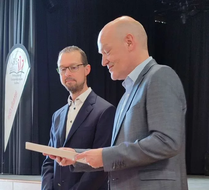 Am 21.03.2024 gab der Leitende Schulamtsdirektor Jochen Reinhardt vom Staatlichen Schulamt in Weilburg im Rahmen einer Dienstversammlung die Auswahl von Herrn Stefan Klotz zum neuen Schulleiter bekannt. Auf freundliche und charmante Weise drückte er dabei auch seinen Dank für die Leistungen aller Schulleitungsmitglieder in der Zeit der Vakanz aus. Herr Klotz, den man sicher als Urgestein der Gesamtschule Solms bezeichnen kann, folgt damit Frau Anke Wegerle, die zum Februar 2023 in den Ruhestand gegangen war.