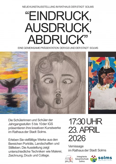 Die Integrierte Gesamtschule Solms lädt herzlich zur Kunstausstellung „Eindruck, Ausdruck, Abdruck“ im Rathaus der Stadt Solms ein. Schülerinnen und Schüler der Jahrgangsstufen 5 bis 10 präsentieren dort ihre vielfältigen und kreativen Werke aus den Bereichen Porträt, Landschaft und Stillleben.